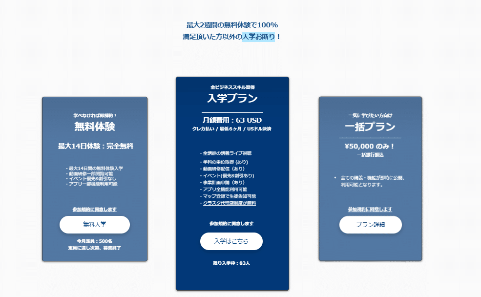 現在毎月限定数だけ無料入学枠を開放しているので入学枠が残っていたらとりあえず始めてみてはいかがでしょうか。毎月数十万稼ぎながらスキルを身につけている学生も少なくありません。