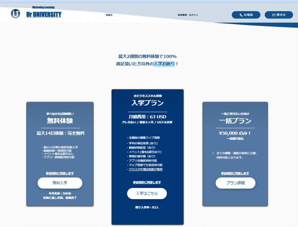 その前に、もし時間と少しばかりの余裕があるのであれば、UR-Uを試してみてはいかがでしょうか?リアルに使えるビジネススキルば学べて、人脈が広がり、代理店制度で授業料以上にお金を稼げる18000人超が入学しているオンラインスクール。