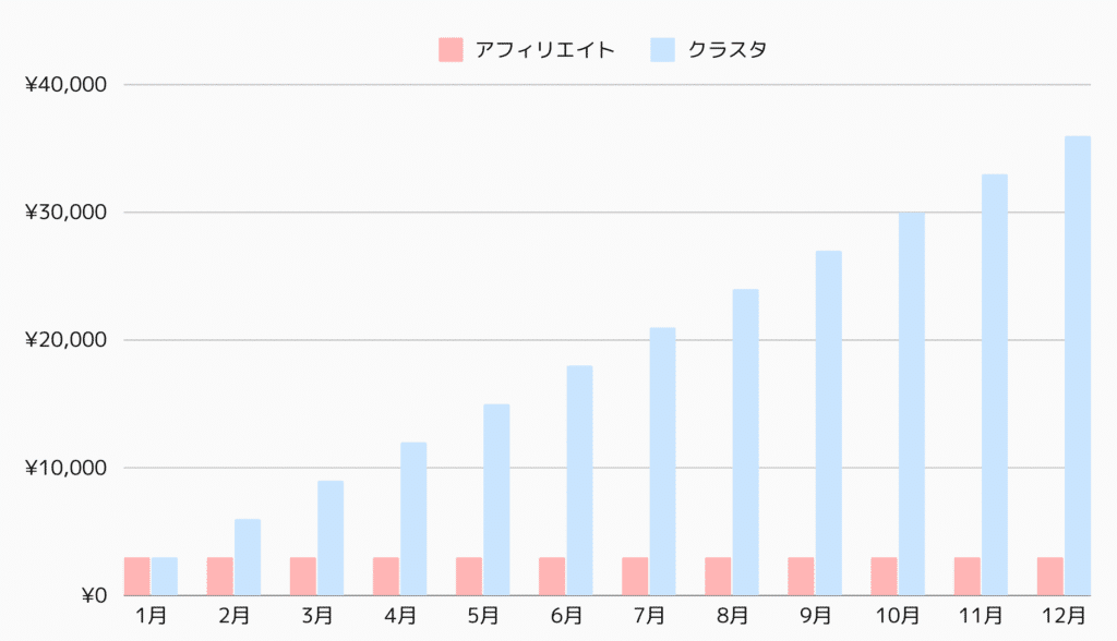 毎月1件ずつ3,000円の報酬が発生する商品を販売した時の、クラスタとアフィリエイトの違い。クラスタは解約が発生しない限り、報酬が積み上がる。